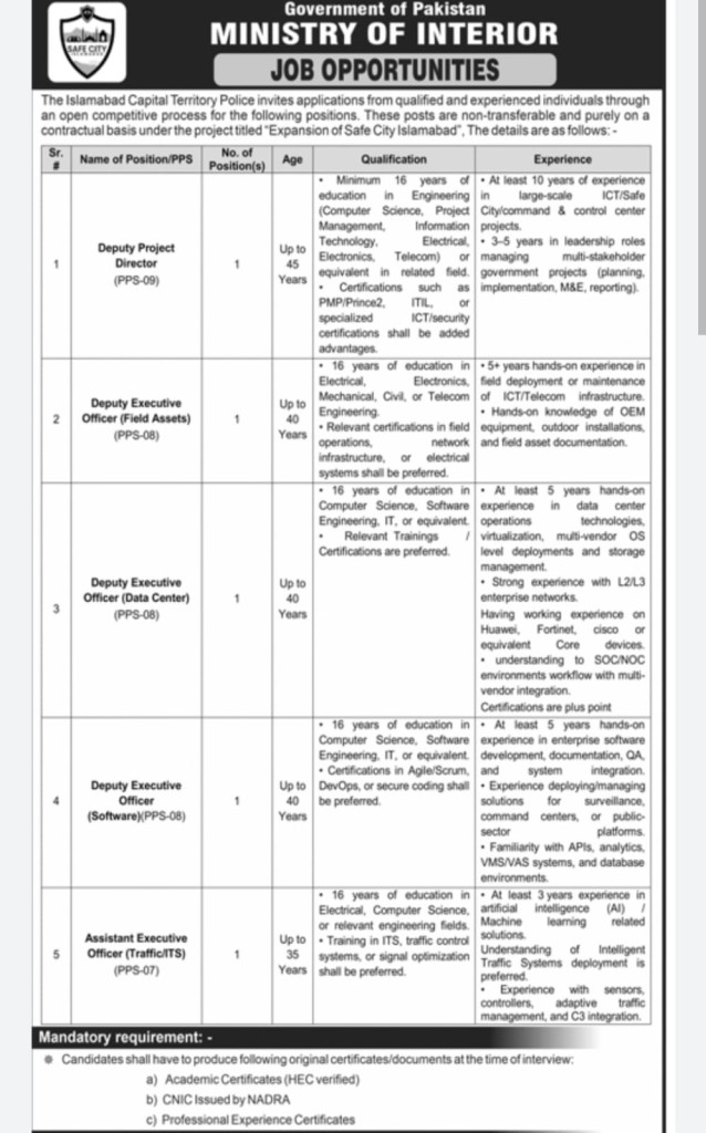 The Islamabad Capital Territory Police invites applications from qualified and experienced individuals through an open competitive process. For the Ministry of Interior Jobs Opportunities 2026.